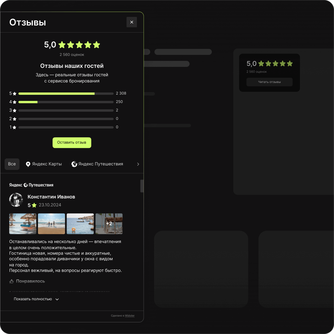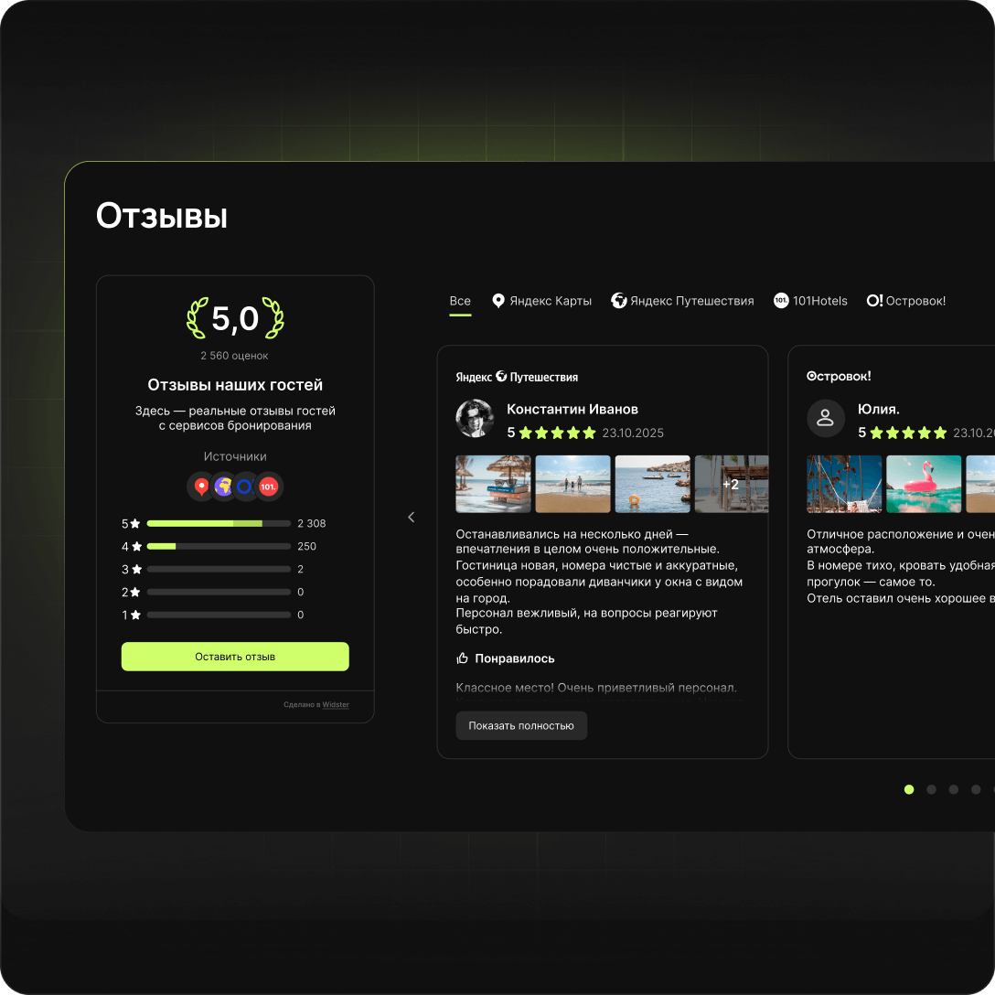 Вы собираете отзывы из популярных сервисов на свой сайт и размещаете их в удобном и красивом блоке.