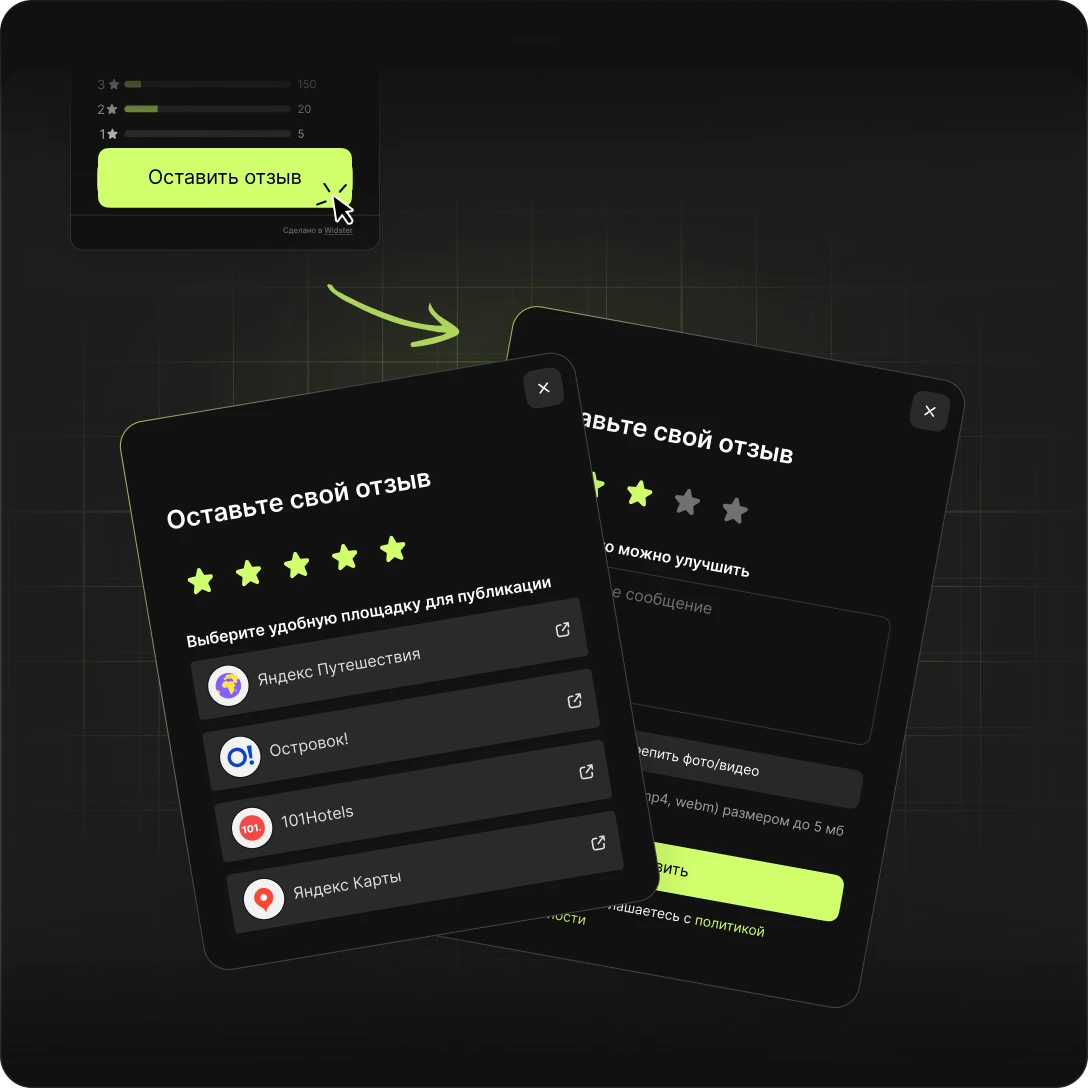 Используйте функционал перехвата негатива: клиент оставляет оценку компании, и при низком рейтинге появляется форма обратной связи — отзыв направляется в нужный отдел. Если оценка высокая, пользователю предлагаются площадки, где важно усилить рейтинг.
